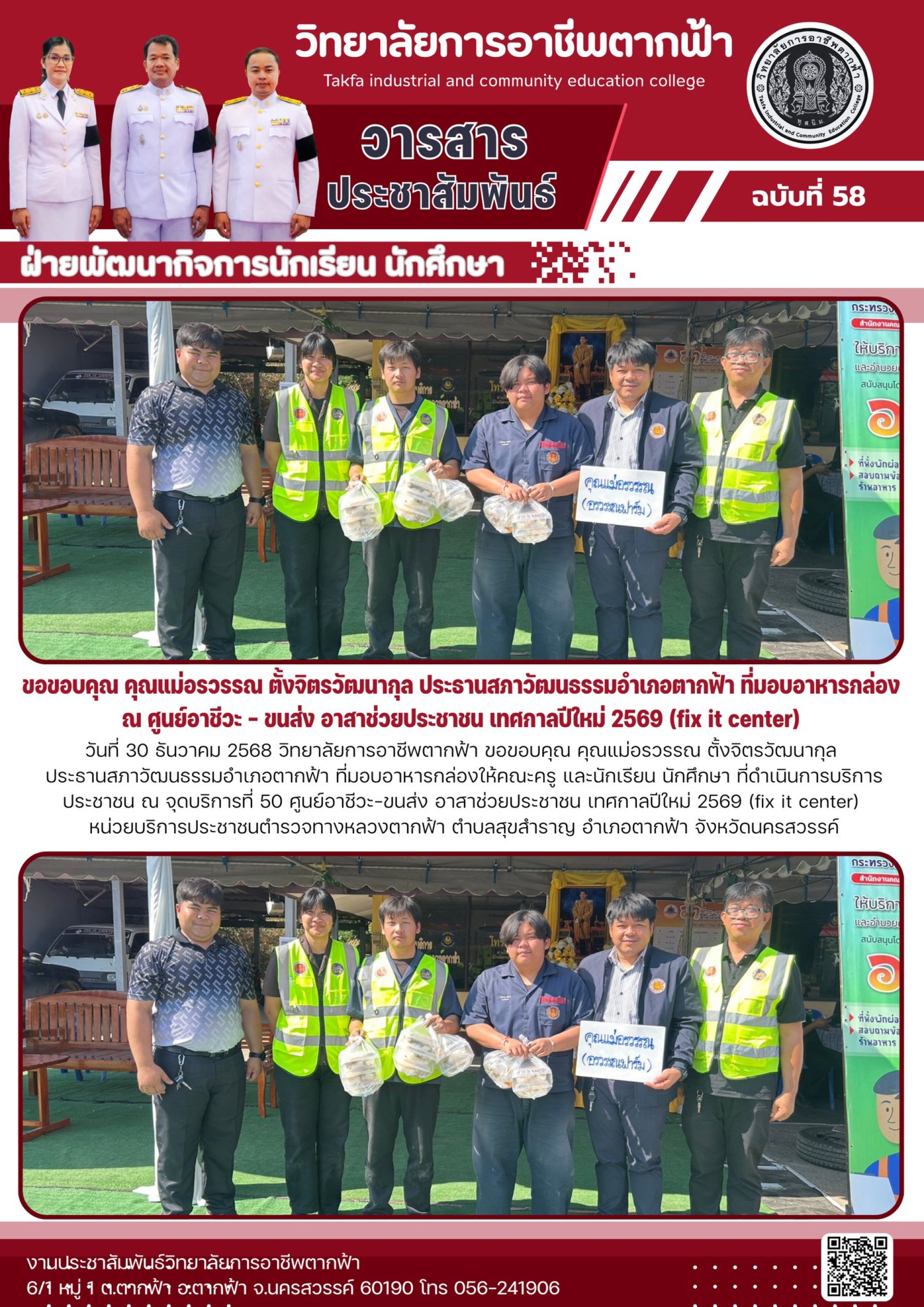 ฉบับที่ 58 ขอขอบคุณ คุณแม่อรวรรณ ตั้งจิตรวัฒนากุล ประธานสภาวัฒนธรรมอำเภอตากฟ้า ที่มอบอาหารกล่อง ณ ศูนย์อาชีวะ - ขนส่ง อาสาช่วยประชาชน เทศกาลปีใหม่ 2569 (fix it center)