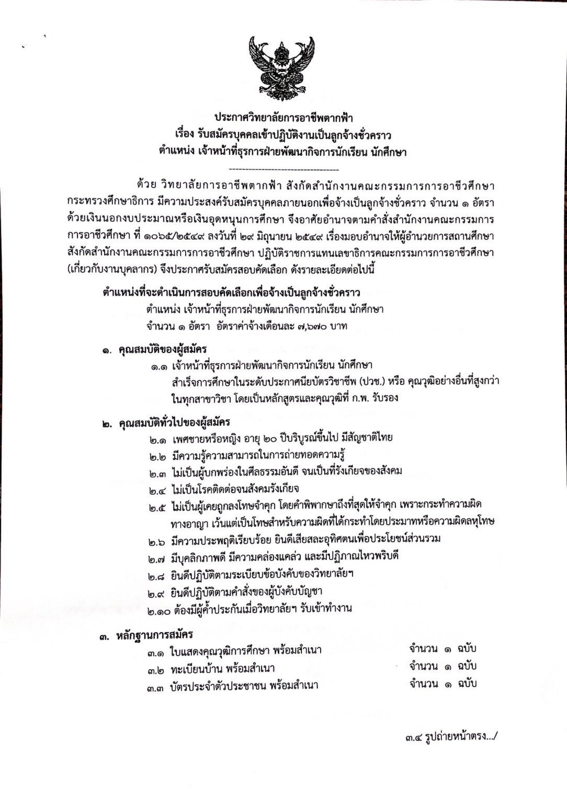 ประกาศ วิทยาลัยการอาชีพตากฟ้า เรื่อง รับสมัครบุคคลเข้าปฎิบัติงานเป็นลูกจ้างชั่วคราว ตำแหน่งเจ้าหน้าที่ธุรการฝ่ายพัฒนากิจการนักเรียนนักศึกษา รับสมัครตั้งแต่วันที่ 6-14 มกราคม 2569