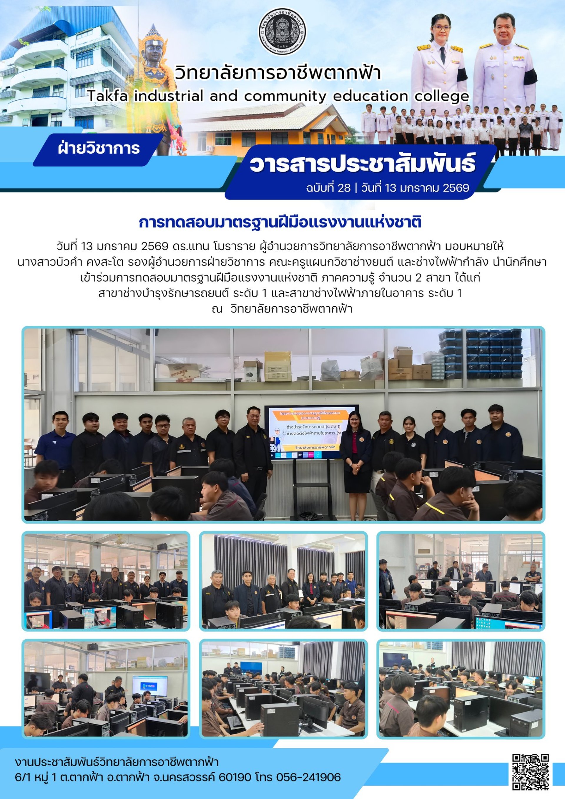 วันที่ 13 มกราคม 2569 ดร.แทน โมราราย ผู้อำนวยการวิทยาลัยการอาชีพตากฟ้า มอบหมายให้ นางสาวบัวคำ คงสะโต รองผู้อำนวยการฝ่ายวิชาการ คณะครูแผนกวิชาช่างยนต์ และช่างไฟฟ้ากำลัง นำนักศึกษา เข้าร่วมการทดสอบมาตรฐานฝีมือแรงงานแห่งชาติ ภาคความรู้ จำนวน 2 สาขา ได้แก่ สาขาช่างบำรุงรักษารถยนต์ ระดับ 1 และสาขาช่างไฟฟ้าภายในอาคาร ระดับ 1 ณ วิทยาลัยการอาชีพตากฟ้า