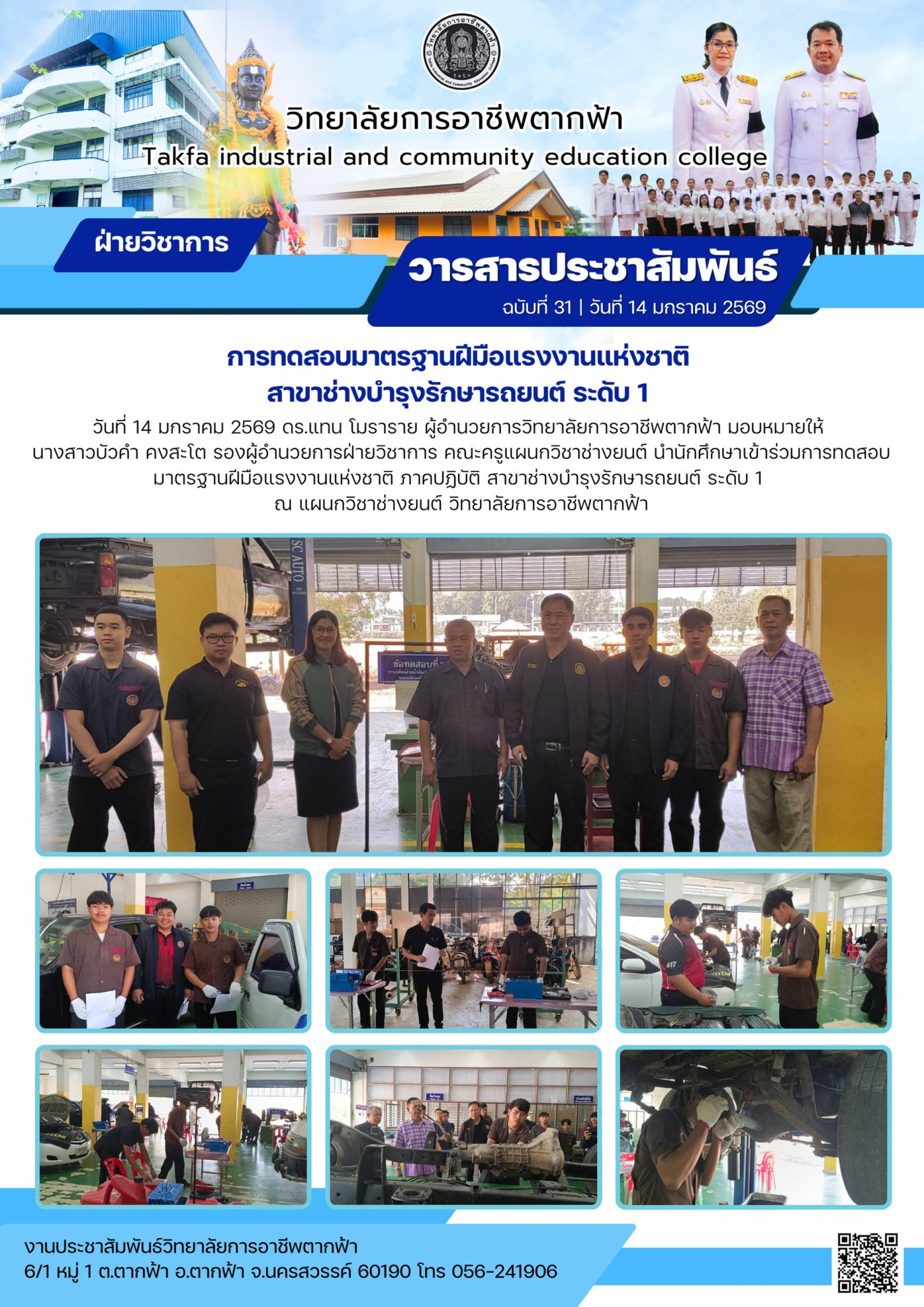 วันที่ 14 มกราคม 2569 ดร.แทน โมราราย ผู้อำนวยการวิทยาลัยการอาชีพตากฟ้า มอบหมายให้ นางสาวบัวคำ คงสะโต รองผู้อำนวยการฝ่ายวิชาการ คณะครูแผนกวิชาช่างยนต์ นำนักศึกษาเข้าร่วมการทดสอบมาตรฐานฝีมือแรงงานแห่งชาติ ภาคปฏิบัติ สาขาช่างบำรุงรักษารถยนต์ ระดับ 1 ณ แผนกวิชาช่างยนต์ วิทยาลัยการอาชีพตากฟ้า