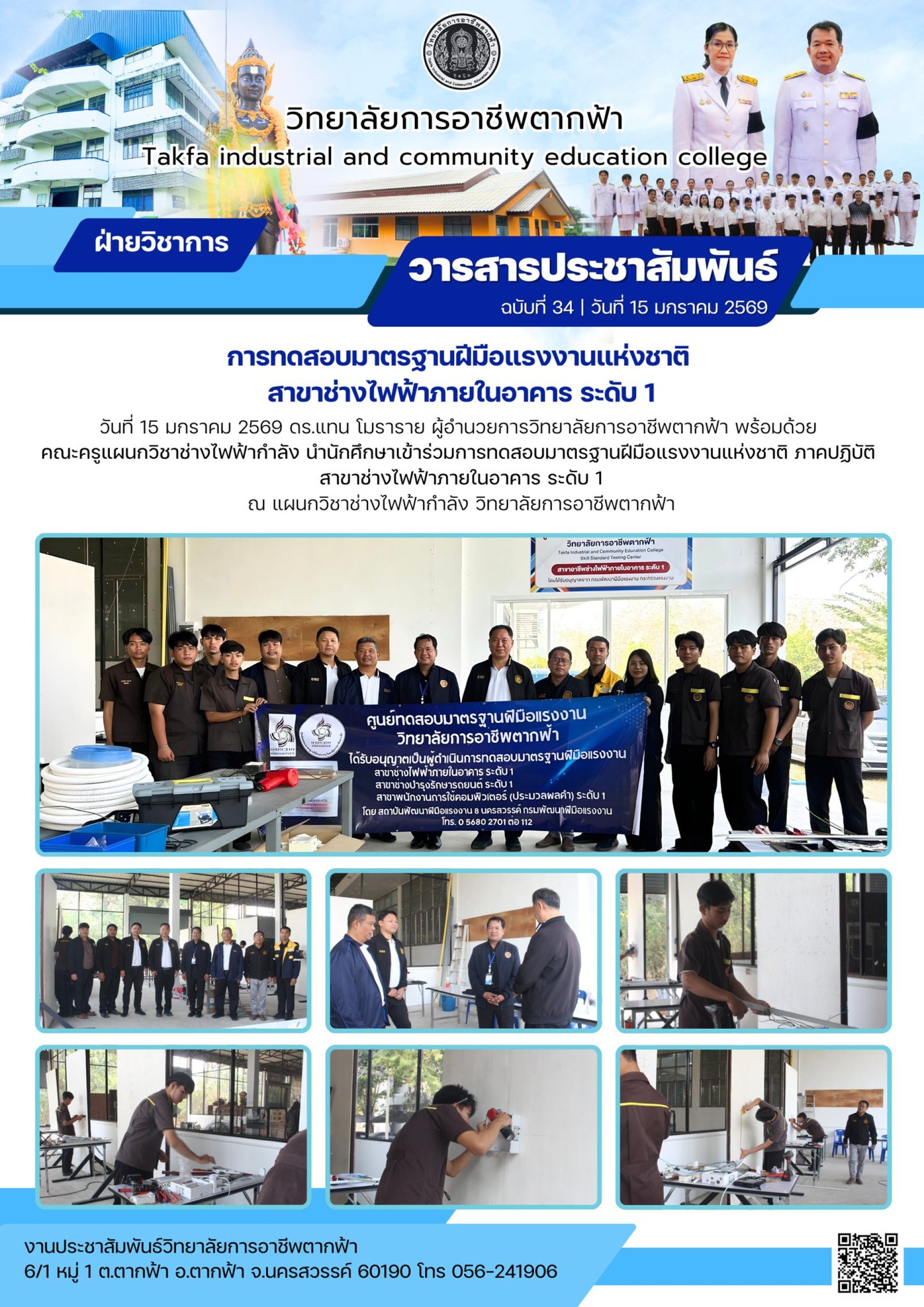 วันที่ 15 มกราคม 2569 ดร.แทน โมราราย ผู้อำนวยการวิทยาลัยการอาชีพตากฟ้า พร้อมด้วย คณะครูแผนกวิชาช่างไฟฟ้ากำลัง นำนักศึกษาเข้าร่วมการทดสอบมาตรฐานฝีมือแรงงานแห่งชาติ ภาคปฏิบัติ สาขาช่างไฟฟ้าภายในอาคาร ระดับ 1 ณ แผนกวิชาช่างไฟฟ้ากำลัง วิทยาลัยการอาชีพตากฟ้า