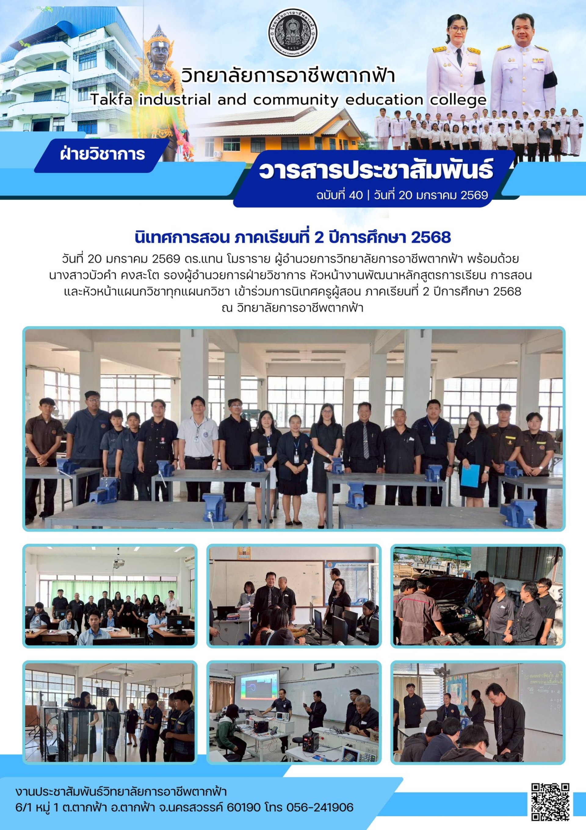 วันที่ 20 มกราคม 2569 ดร.แทน โมราราย ผู้อำนวยการวิทยาลัยการอาชีพตากฟ้า พร้อมด้วย นางสาวบัวคำ คงสะโต รองผู้อำนวยการฝ่ายวิชาการ หัวหน้างานพัฒนาหลักสูตรการเรียน การสอน และหัวหน้าแผนกวิชาทุกแผนกวิชา เข้าร่วมการนิเทศครูผู้สอน ภาคเรียนที่ 2 ปีการศึกษา 2568