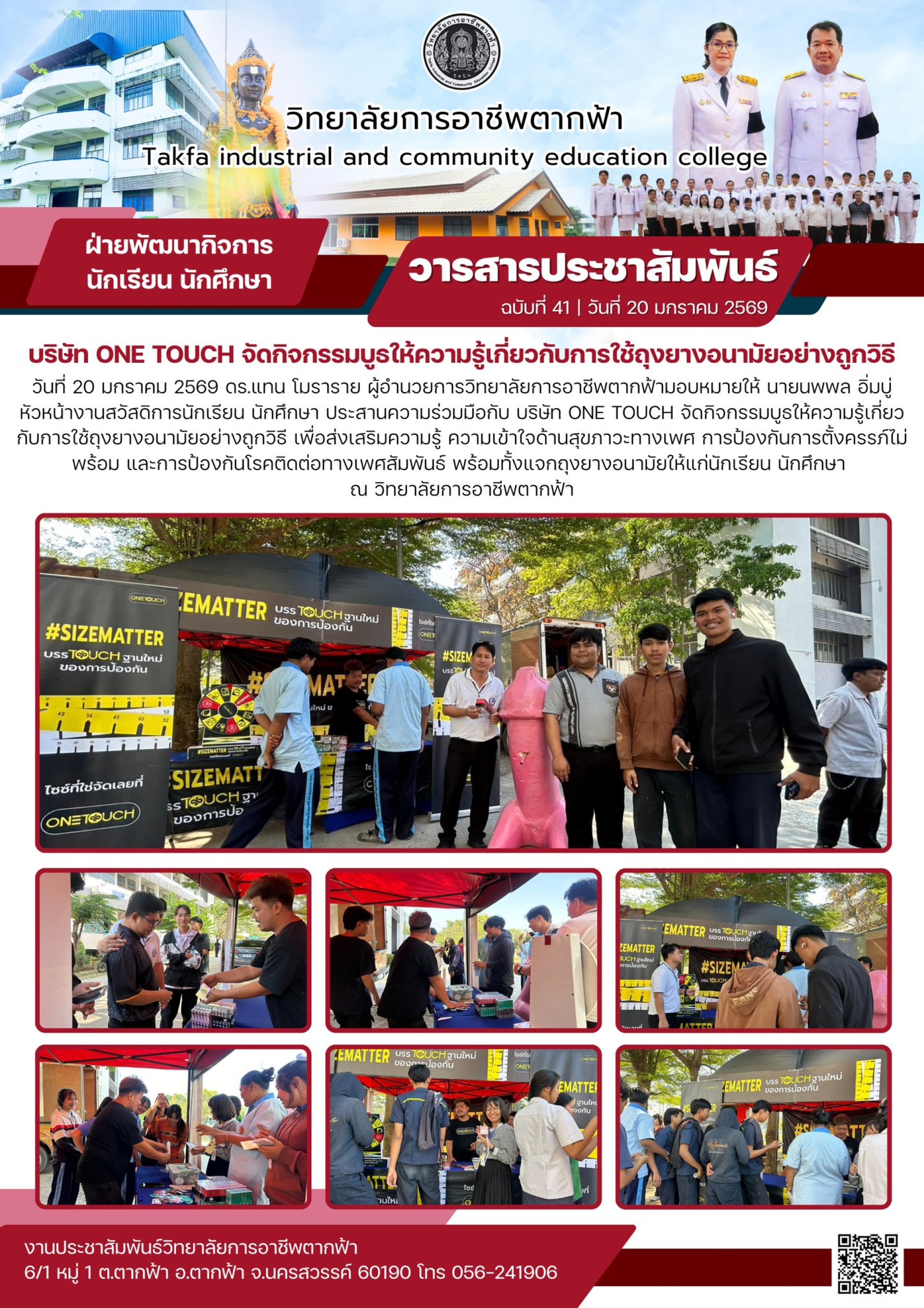 วันที่ 20 มกราคม 2569 ดร.แทน โมราราย ผู้อำนวยการวิทยาลัยการอาชีพตากฟ้ามอบหมายให้ นายนพพล อิ่มบู่ หัวหน้างานสวัสดิการนักเรียน นักศึกษา ประสานความร่วมมือกับ บริษัท ONE TOUCH จัดกิจกรรมบูธให้ความรู้เกี่ยวกับการใช้ถุงยางอนามัยอย่างถูกวิธี เพื่อส่งเสริมความรู้ ความเข้าใจด้านสุขภาวะทางเพศ การป้องกันการตั้งครรภ์ไม่พร้อม และการป้องกันโรคติดต่อทางเพศสัมพันธ์ พร้อมทั้งแจกถุงยางอนามัยให้แก่นักเรียน นักศึกษา ณ วิทยาลัยการอาชีพตากฟ้า