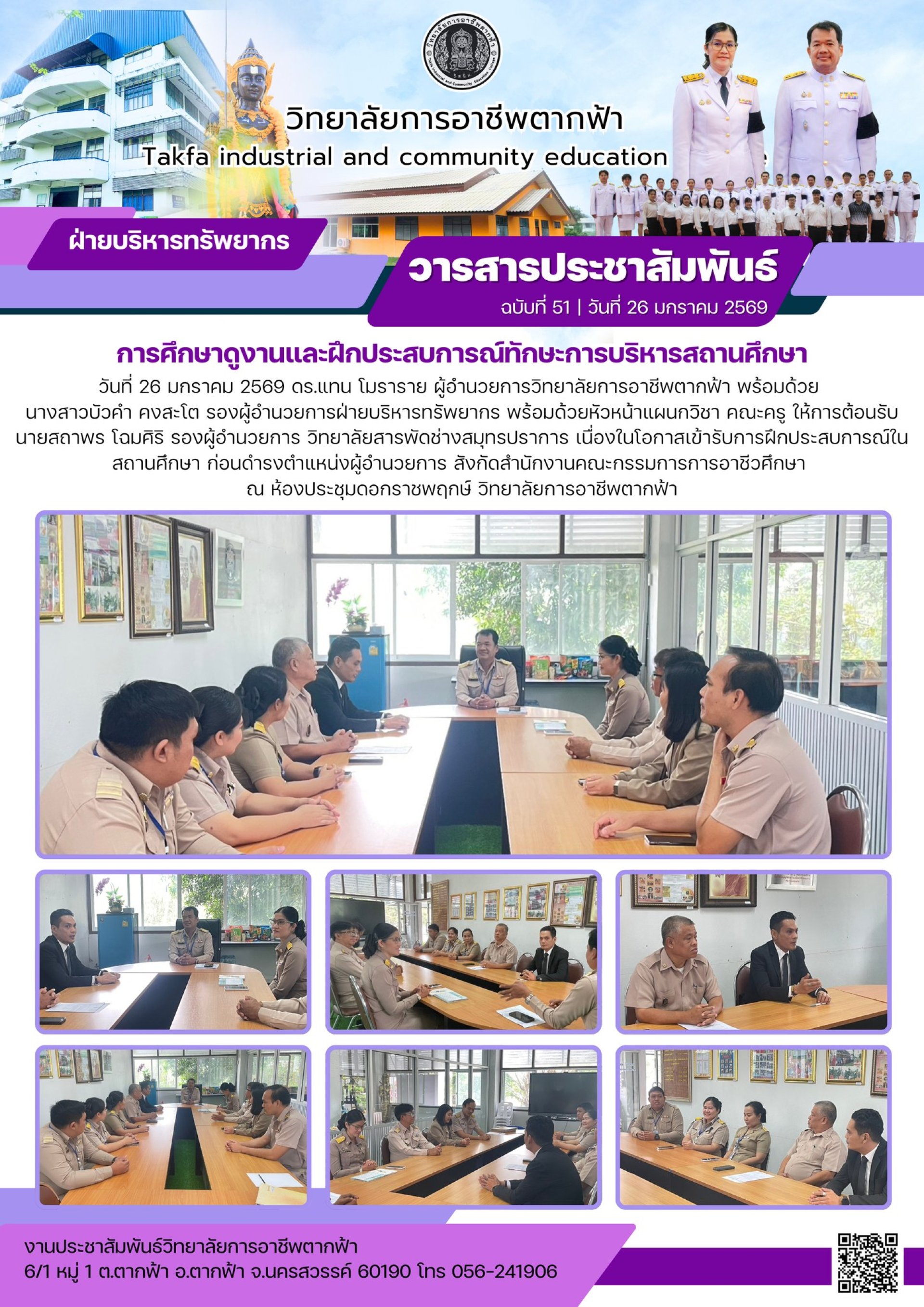 วันที่ 26 มกราคม 2569 ดร.แทน โมราราย ผู้อำนวยการวิทยาลัยการอาชีพตากฟ้า พร้อมด้วย นางสาวบัวคำ คงสะโต รองผู้อำนวยการฝ่ายบริหารทรัพยากร พร้อมด้วยหัวหน้าแผนกวิชา คณะครู ให้การต้อนรับ นายสถาพร โฉมศิริ รองผู้อำนวยการ วิทยาลัยสารพัดช่างสมุทรปราการ เนื่องในโอกาสเข้ารับการฝึกประสบการณ์ในสถานศึกษา ก่อนดำรงตำแหน่งผู้อำนวยการ สังกัดสำนักงานคณะกรรมการการอาชีวศึกษา ณ ห้องประชุมดอกราชพฤกษ์ วิทยาลัยการอาชีพตากฟ้า