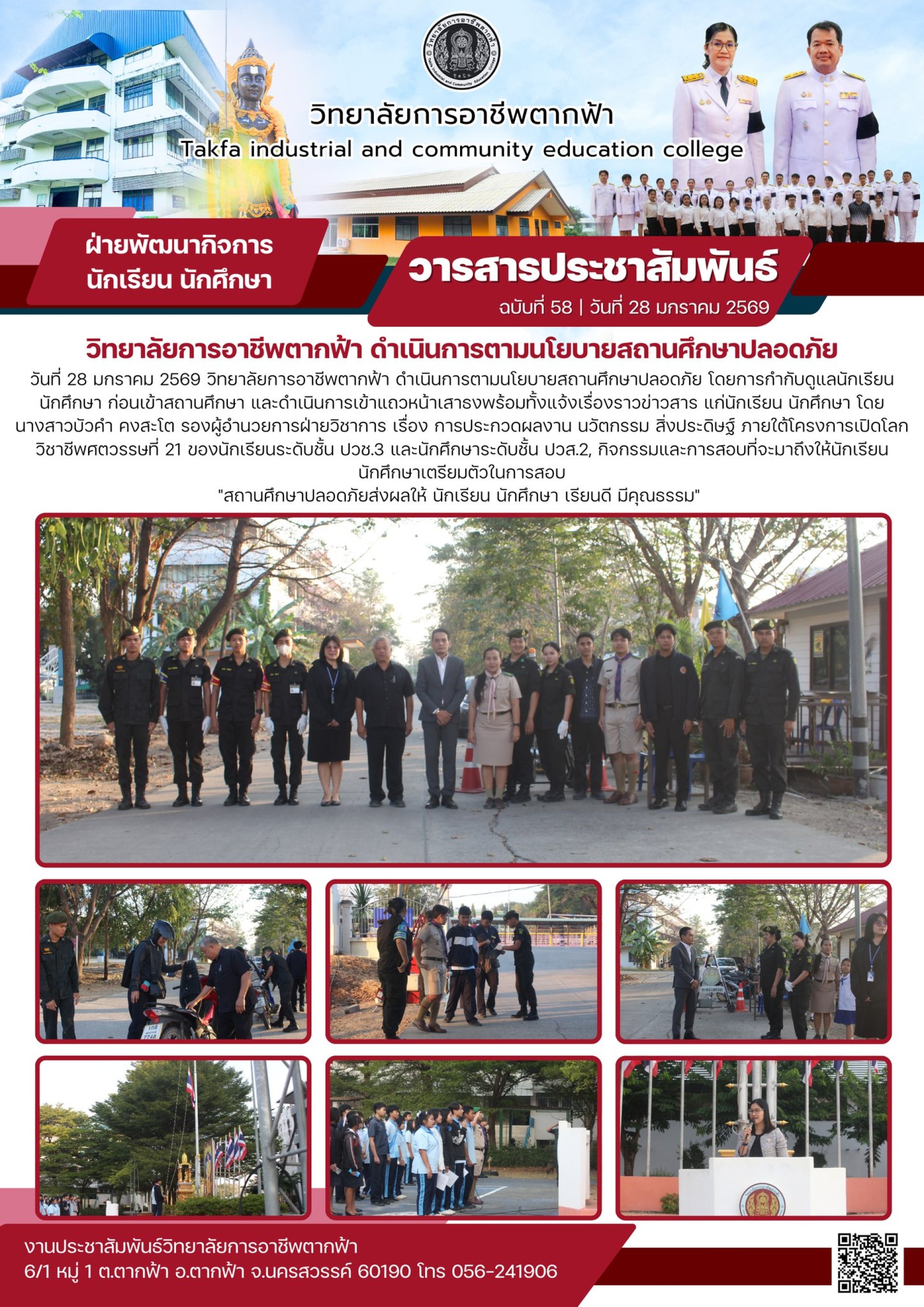 วารสารตากฟ้า ประจำเดือน มกราคม 2569 ฉบับที่ 58 วิทยาลัยการอาชีพตากฟ้า ดำเนินการตามนโยบายสถานศึกษาปลอดภัย