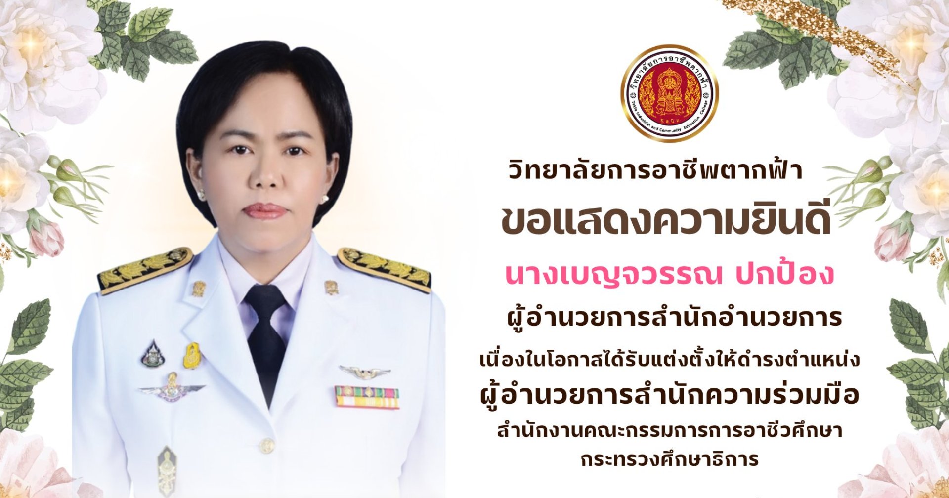 วิทยาลัยการอาชีพตากฟ้า ขอแสดงความยินดีกับ นางเบญจวรรณ ปกป้อง ผู้อำนวยการสำนักอำนวยการ เนื่องในโอกาสได้รับแต่งตั้งให้ดำรงแหน่ง ผู้อำนวยการสำนักความร่วมมือ สำนักงานคณะกรรมการการอาชีวศึกษา กระทรวงศึกษาธิการ