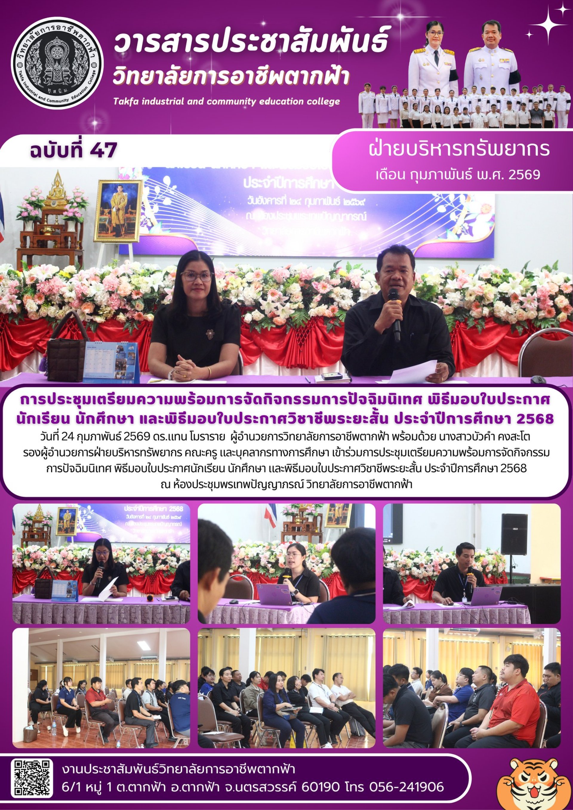 วารสารตากฟ้า ประจำเดือน กุมภาพันธ์ 2569 ฉบับที่ 47 การประชุมเตรียมความพร้อมการจัดกิจกรรมการปัจฉิมนิเทศ พิธีมอบใบประกาศนักเรียน นักศึกษา และพิธีมอบใบประกาศวิชาชีพระยะสั้น ประจำปีการศึกษา 2568