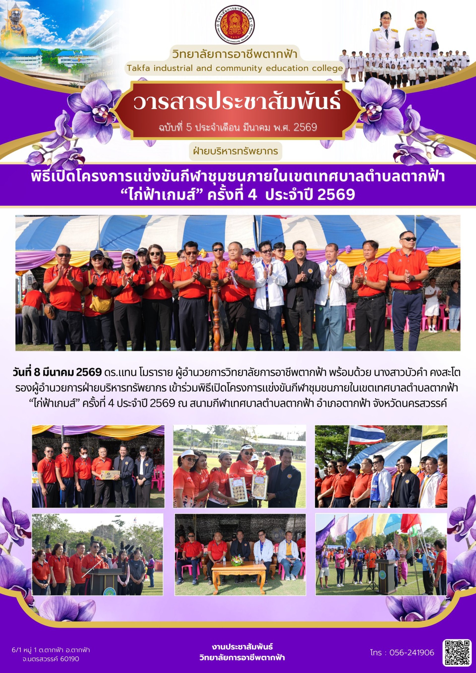 วารสารตากฟ้า ประจำเดือน มีนาคม 2569 ฉบับที่ 5 พิธีเปิดโครงการแข่งขันกีฬาชุมชนภายในเขตเทศบาลตำบลตากฟ้า “ไก่ฟ้าเกมส์” ครั้งที่ 4 ประจำปี 2569