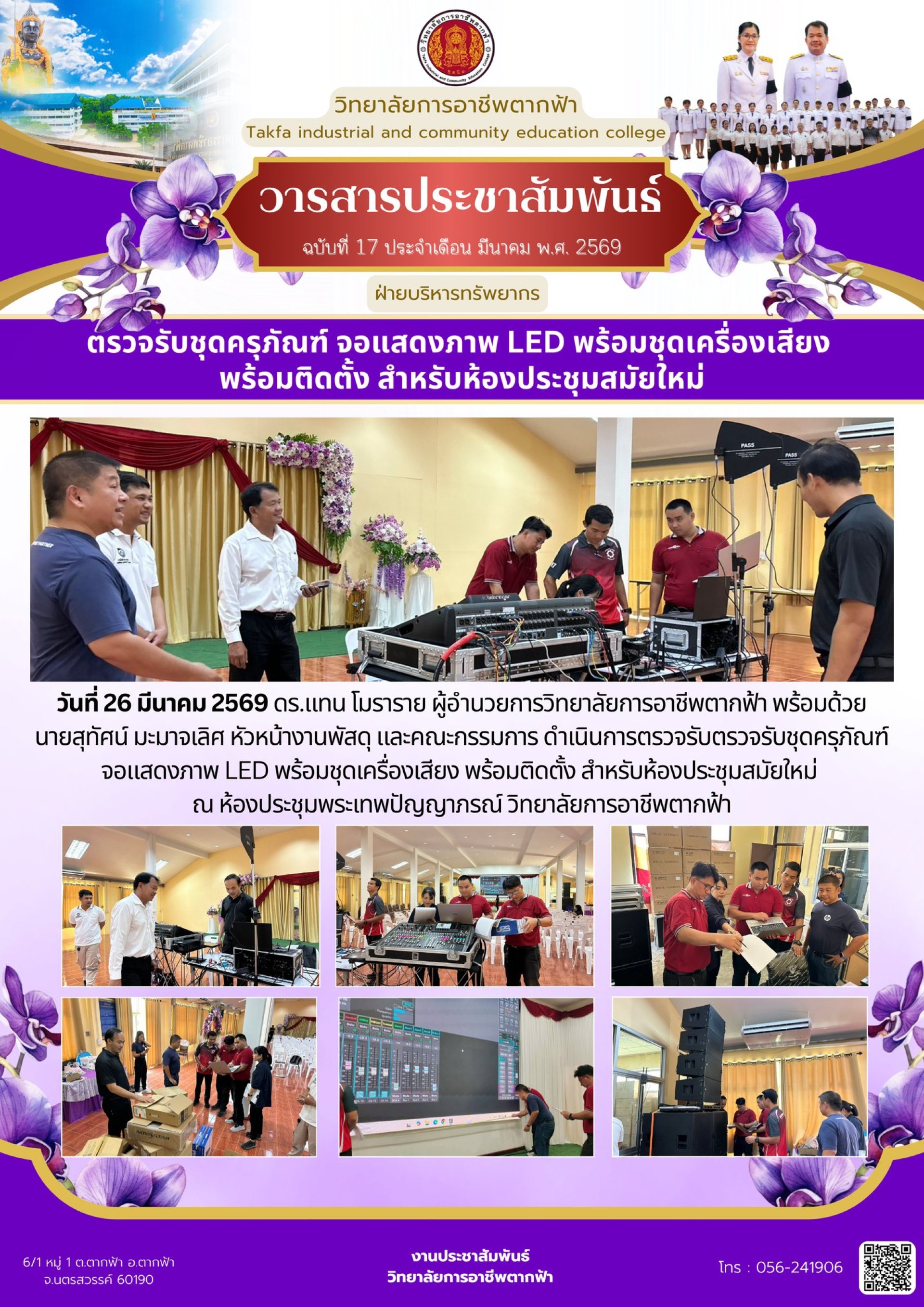 วารสารตากฟ้า ประจำเดือน มีนาคม 2569 ฉบับที่ 17 ตรวจรับชุดครุภัณฑ์ จอแสดงภาพ LED พร้อมชุดเครื่องเสียง พร้อมติดตั้ง สำหรับห้องประชุมสมัยใหม่