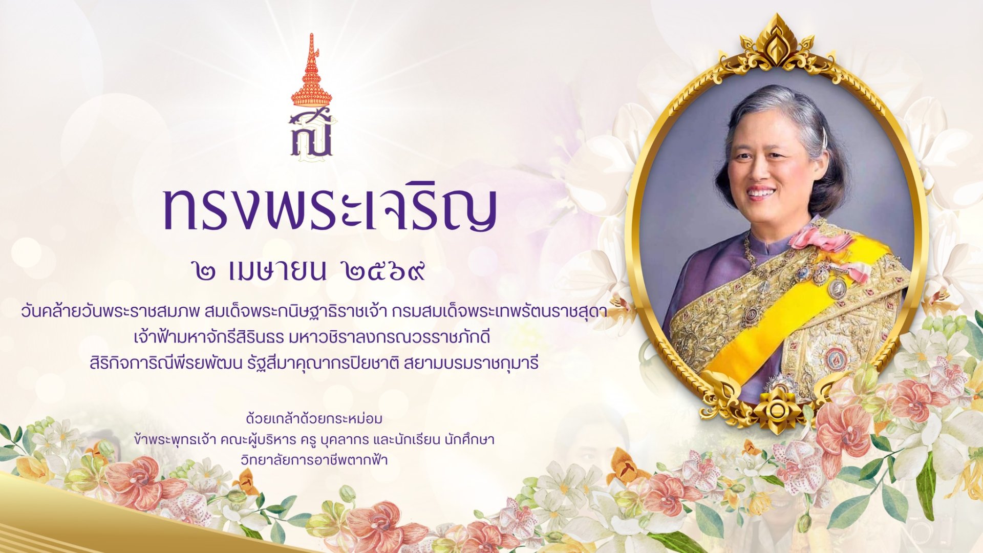 ๒ เมษายน ๒๕๖๙ ทรงพระเจริญ วันคล้ายวันพระราชสมภพ สมเด็จพระกนิษฐาธิราชเจ้า กรมสมเด็จพระเทพรัตนราชสุดา เจ้าฟ้ามหาจักรีสิรินธร มหาวชิราลงกรณวรราชภักดี สิริกิจการิณีพีรยพัฒน รัฐสีมาคุณากรปิยชาติ สยามบรมราชกุมารี ด้วยเกล้าด้วยกระหม่อม ข้าพระพุทธเจ้า คณะผู้บริหา