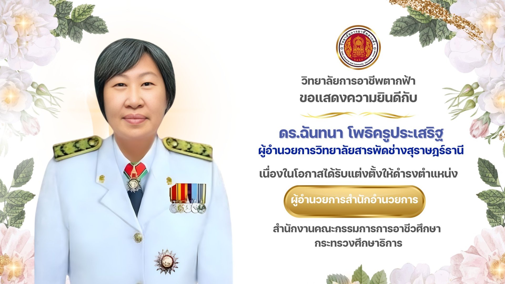 วิทยาลัยการอาชีพตากฟ้า ขอแสดงความยินดีกับผู้บริหารในโอกาสได้รับแต่งตั้งให้ดำรงตำแหน่งใหม่ ดร.ฉันทนา โพธิครูประเสริฐ ผู้อำนวยการวิทยาลัยสารพัดช่างสุราษฎร์ธานี เนื่องในโอกาสได้รับการแต่งตั้งให้ดำรงตำแหน่ง ผู้อำนวยการสำนักอำนวยการ สังกัดสำนักงานคณะกรรมการการ