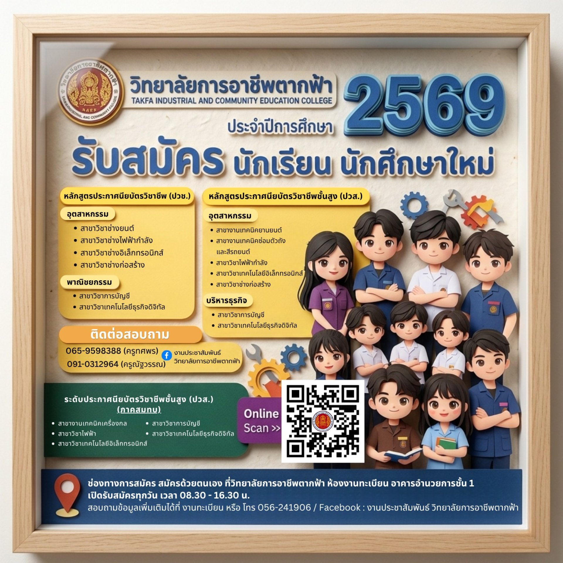 สมัครด้วยตนเองที่ งานทะเบียน วิทยาลัยการอาชีพตากฟ้า