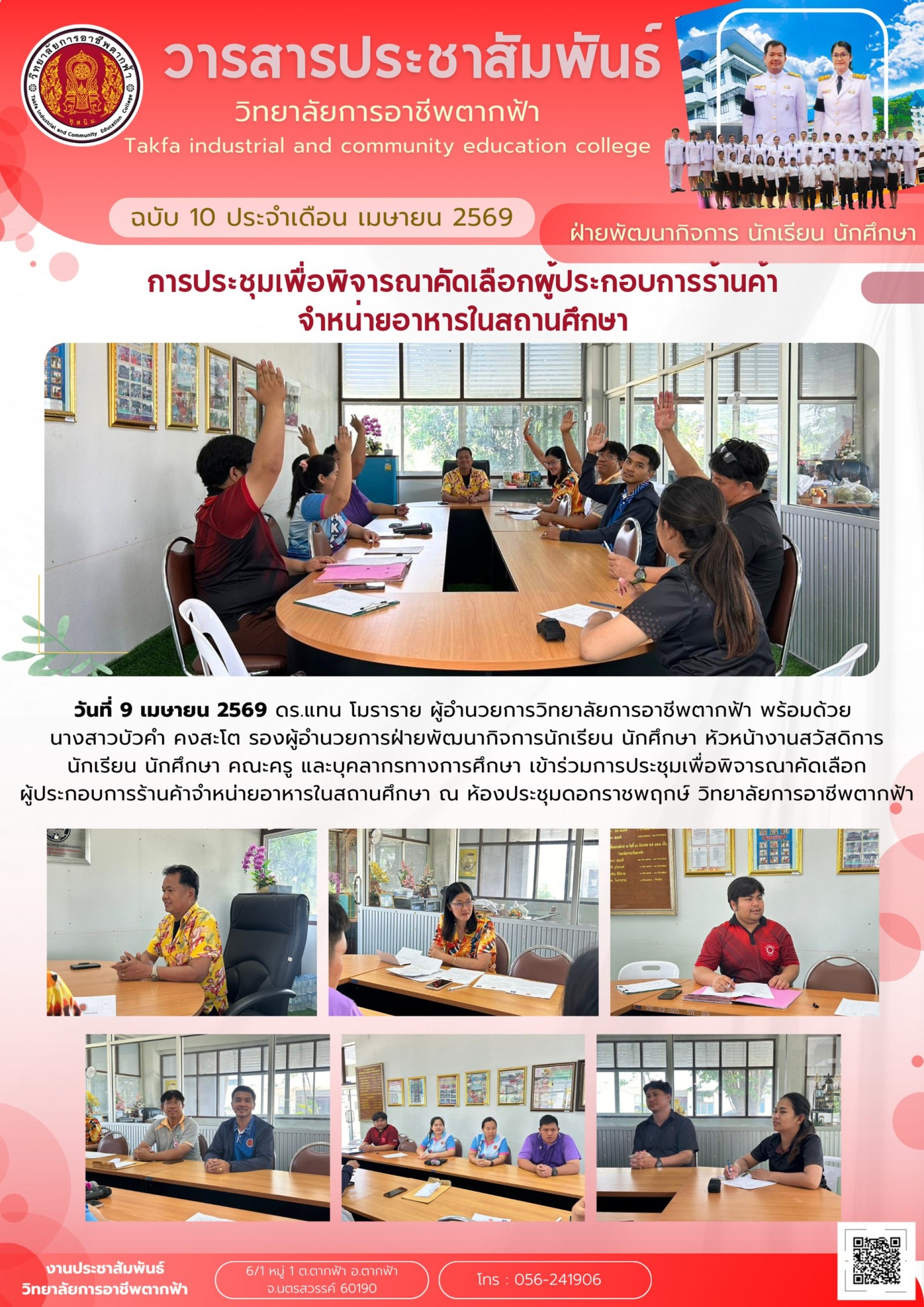 วารสารตากฟ้า ประจำเดือน เมษายน 2569 ฉบับที่ 10 การประชุมเพื่อพิจารณาคัดเลือกผู้ประกอบการร้านค้าจำหน่ายอาหารในสถานศึกษา