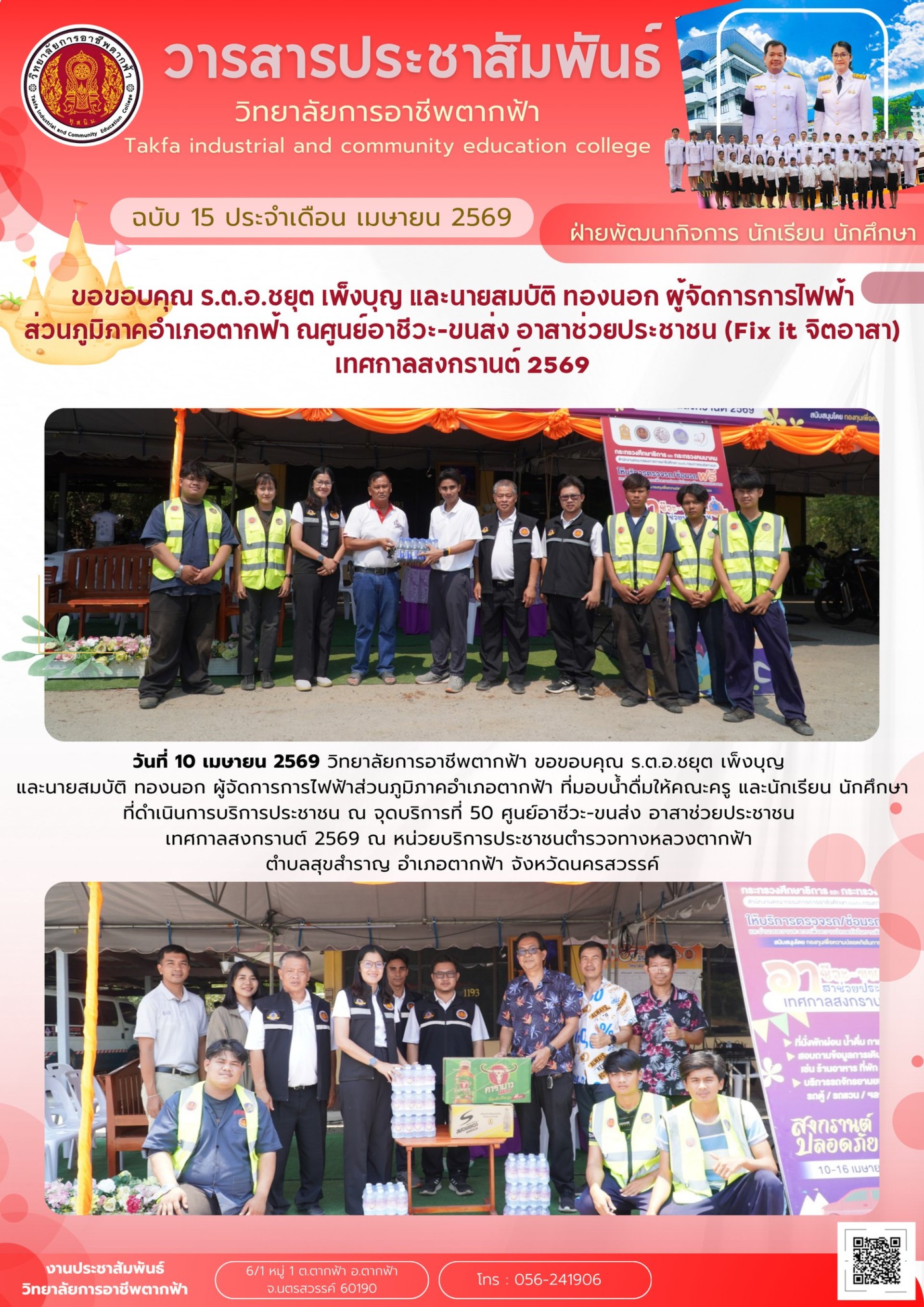 วารสารตากฟ้า ประจำเดือน เมษายน 2569 ฉบับที่ 15 ขอขอบคุณ ร.ต.อ.ชยุต เพ็งบุญ และนายสมบัติ ทองนอก ผู้จัดการการไฟฟ้าส่วนภูมิภาคอำเภอตากฟ้า ณ ศูนย์อาชีวะ-ขนส่ง อาสาช่วยประชาชน (Fix it จิตอาสา) เทศกาลสงกรานต์ 2569