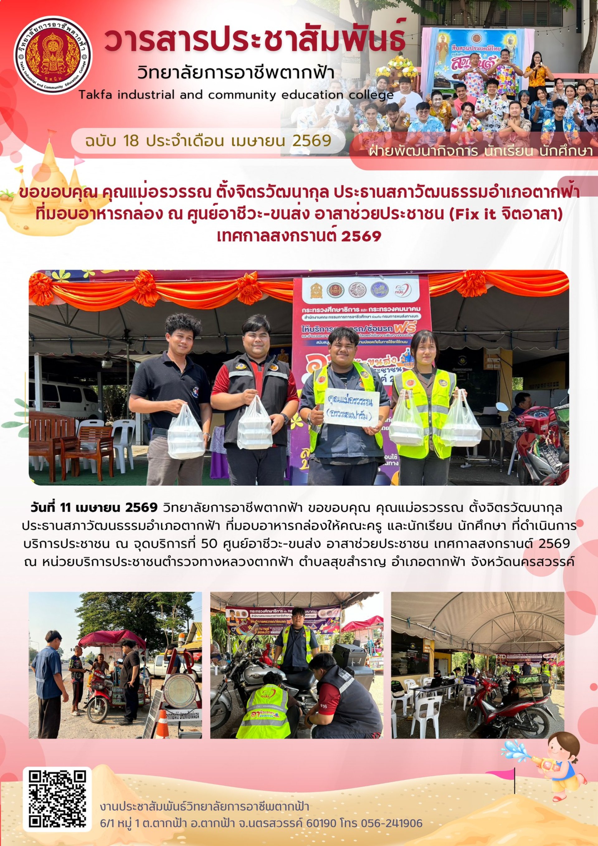 ฉบับที่ 18 ขอขอบคุณ คุณแม่อรวรรณ ตั้งจิตรวัฒนากุล ประธานสภาวัฒนธรรมอำเภอตากฟ้า ที่มอบอาหารกล่อง ณ ศูนย์อาชีวะ-ขนส่ง อาสาช่วยประชาชน (Fix it จิตอาสา) เทศกาลสงกรานต์ 2569