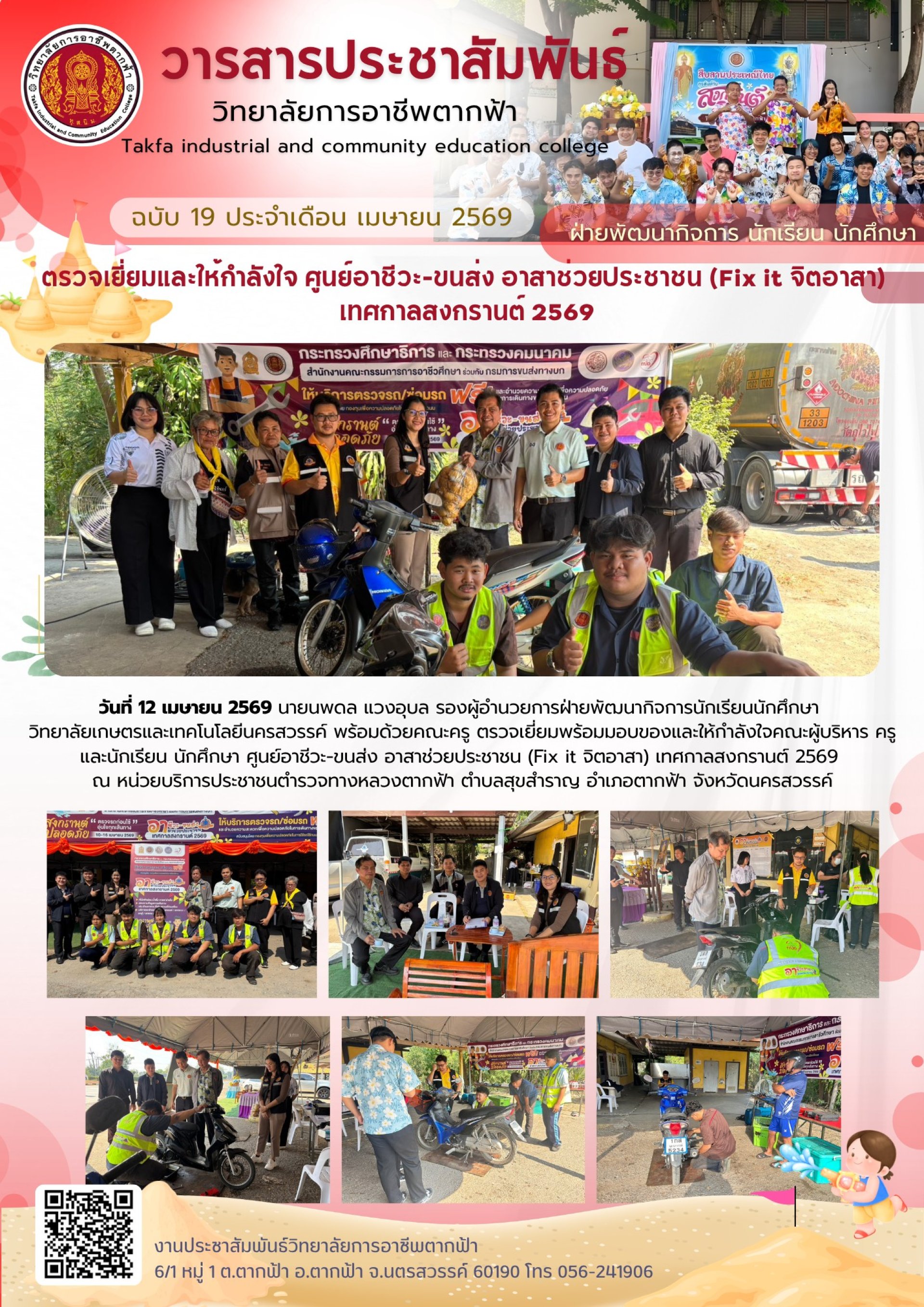 วารสารตากฟ้า ประจำเดือน เมษายน 2569 ฉบับที่ 19 ตรวจเยี่ยมและให้กำลังใจ ศูนย์อาชีวะ-ขนส่ง อาสาช่วยประชาชน (Fix it จิตอาสา) เทศกาลสงกรานต์ 2569