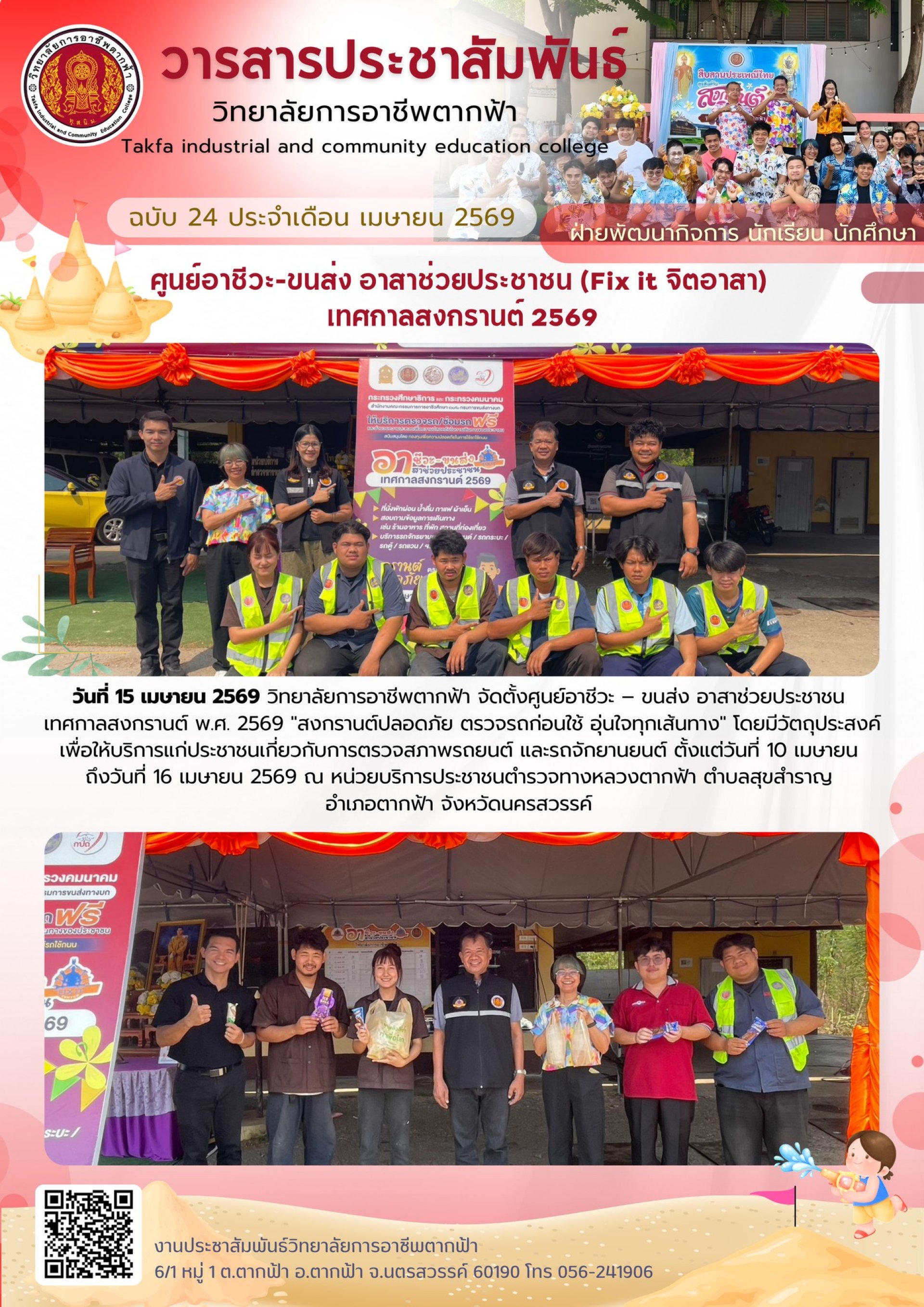 วารสารตากฟ้า ประจำเดือน เมษายน 2569 ฉบับที่ 25 ขอขอบคุณ คุณแม่อรวรรณ ตั้งจิตรวัฒนากุล ประธานสภาวัฒนธรรมอำเภอตากฟ้า ที่มอบอาหารกล่อง ณ ศูนย์อาชีวะ-ขนส่ง อาสาช่วยประชาชน (Fix it จิตอาสา) เทศกาลสงกรานต์ 2569