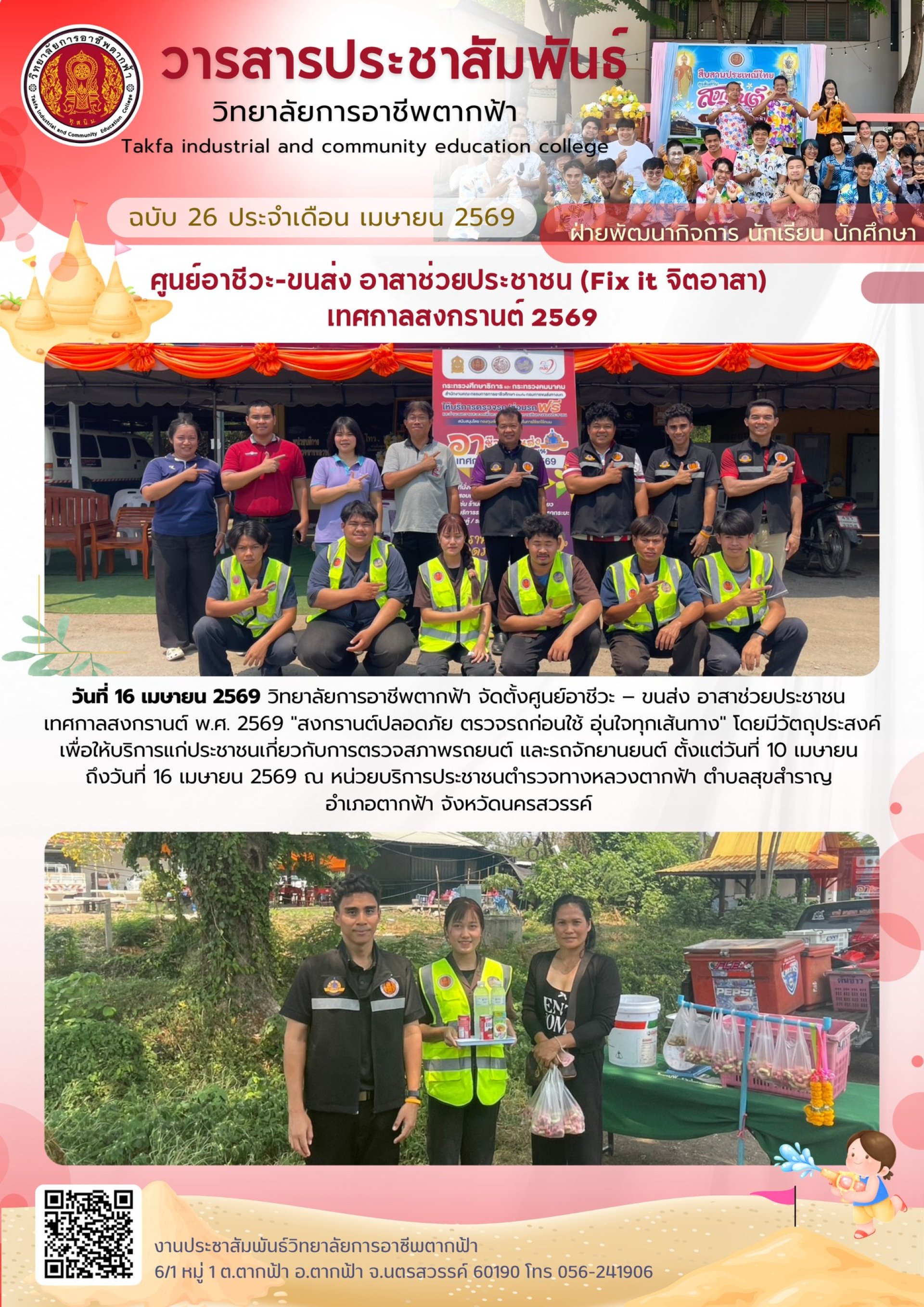 วารสารตากฟ้า ประจำเดือน เมษายน 2569 ฉบับที่ 26 ศูนย์อาชีวะ-ขนส่ง อาสาช่วยประชาชน (Fix it จิตอาสา) เทศกาลสงกรานต์ 2569