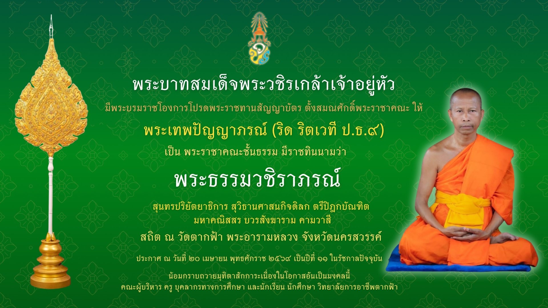 “น้อมถวายมุทิตาสักการะ” พระราชทานสัญญาบัตรตั้งสมณศักดิ์ พระบาทสมเด็จพระปรเมนทรรามาธิบดีศรีสินทรมหาวชิราลงกรณ มหิศรภูมิพลราชวรางกูร กิติสิริสมบูรณอดุลยเดช สยามินทราธิเบศรราชวโรดม บรมนาถบพิตร พระวชิรเกล้าเจ้าอยู่หัว มีพระบรมราชโองการโปรดพระราชทานสัญญาบัตรตั