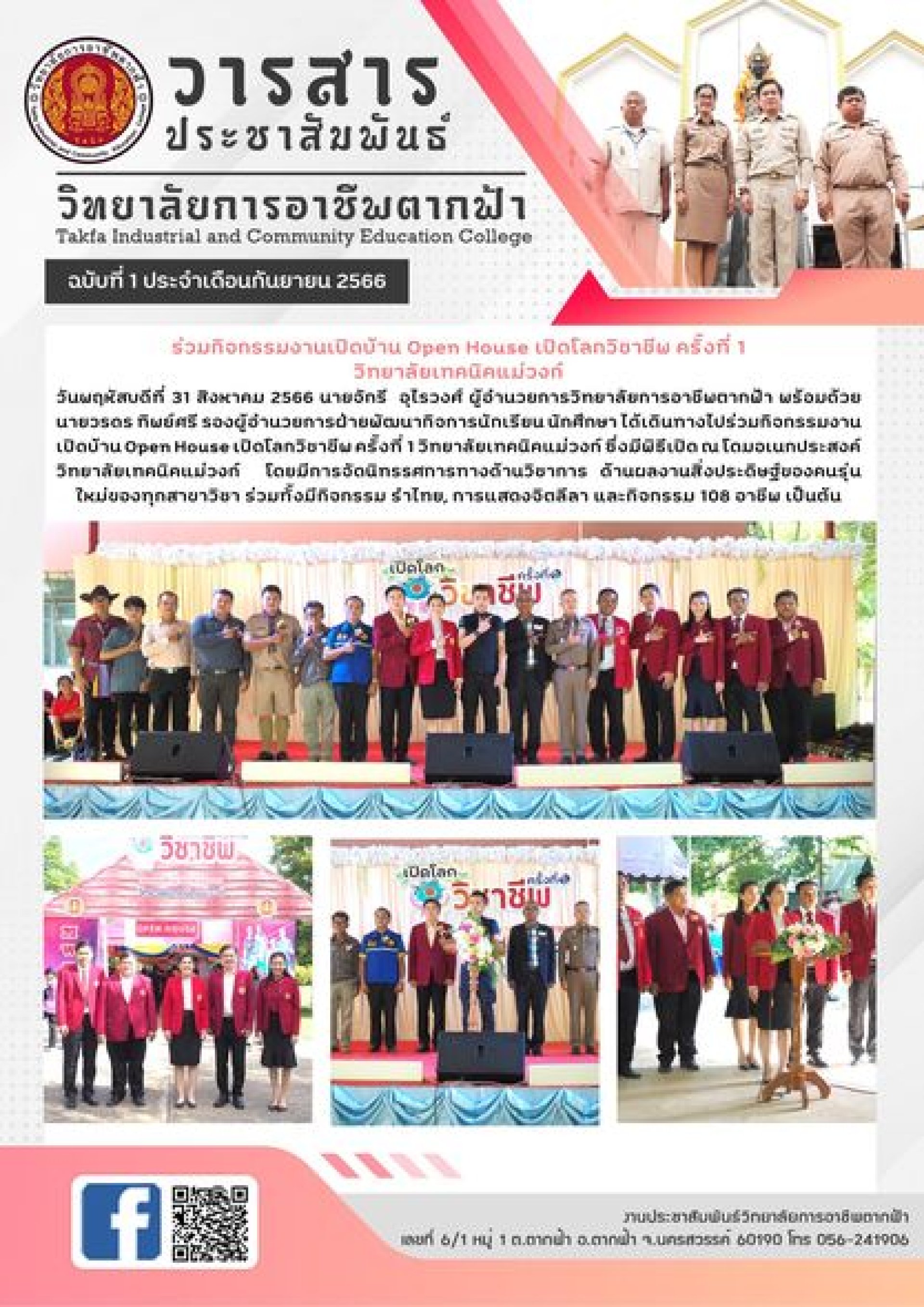 วารสารตากฟ้า ฉบับที่ 1 ร่วมกิจกรรมงานเปิดบ้าน Open House เปิดโลกวิชาชีพ ครั้งที่ 1 วิทยาลัยเทคนิคแม่วงก์ วันพฤหัสบดีที่ 31 สิงหาคม 2566