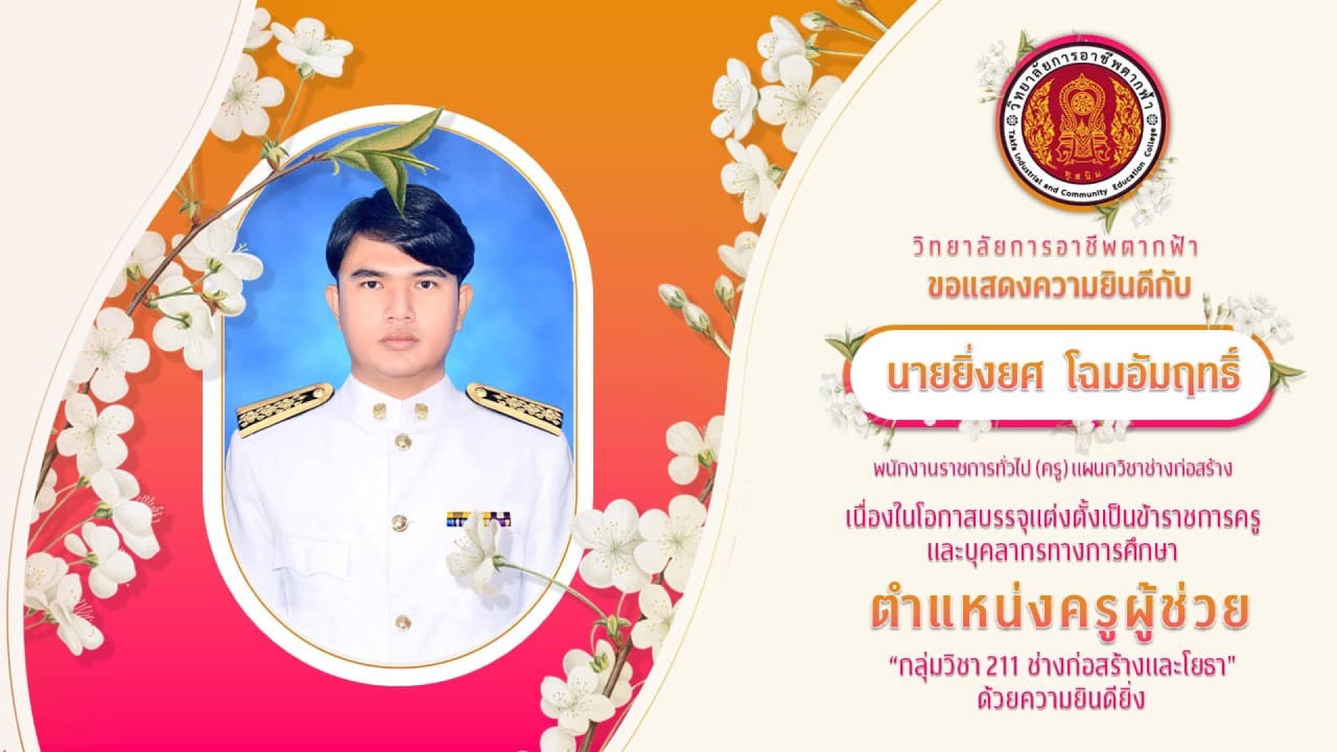 วิทยาลัยการอาชีพตากฟ้า ขอแสดงความยินดีกับนายยิ่งยศ โฉมอัมฤทธิ์ พนักงานราชการทั่วไป (ครู) แผนกวิชาช่างก่อสร้าง - เนื่องในโอกาสบรรจุแต่งตั้งเป็นข้าราชการครู และบุคลากรทางการศึกษา ตำแหน่งครูผู้ช่วย