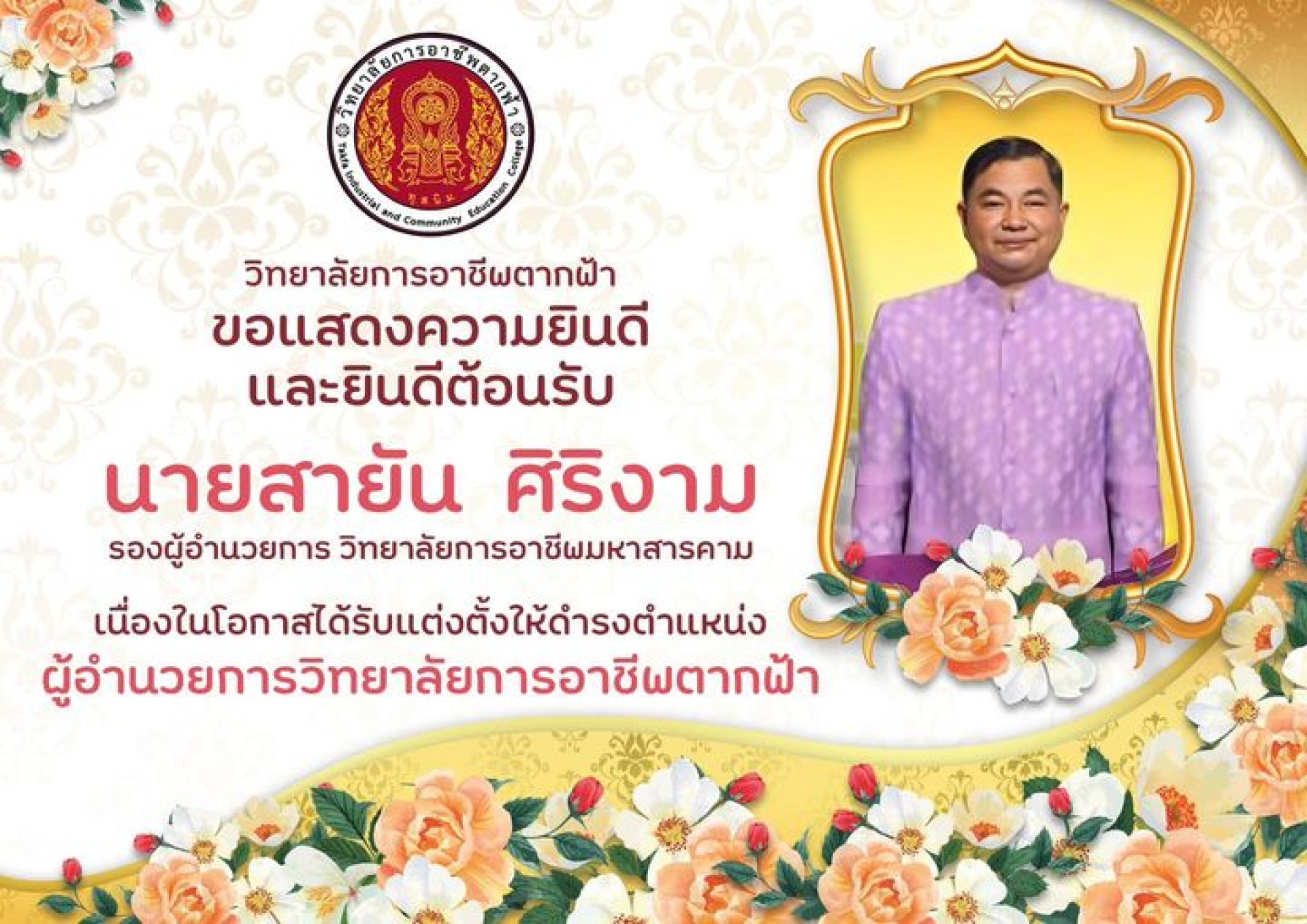 วิทยาลัยการอาชีพตากฟ้า. ขอแสดงความยินดีและยินดีต้อนรับ - นายสายัน ศิริงาม - รองผู้อำนวยการ วิทยาลัยการอาชีพมหาสารคาม เนื่องในโอกาสได้รับแต่งตั้งให้ดำรงตำแหน่ง ผู้อำนวยการวิทยาลัยการอาชีพตากฟ้า
