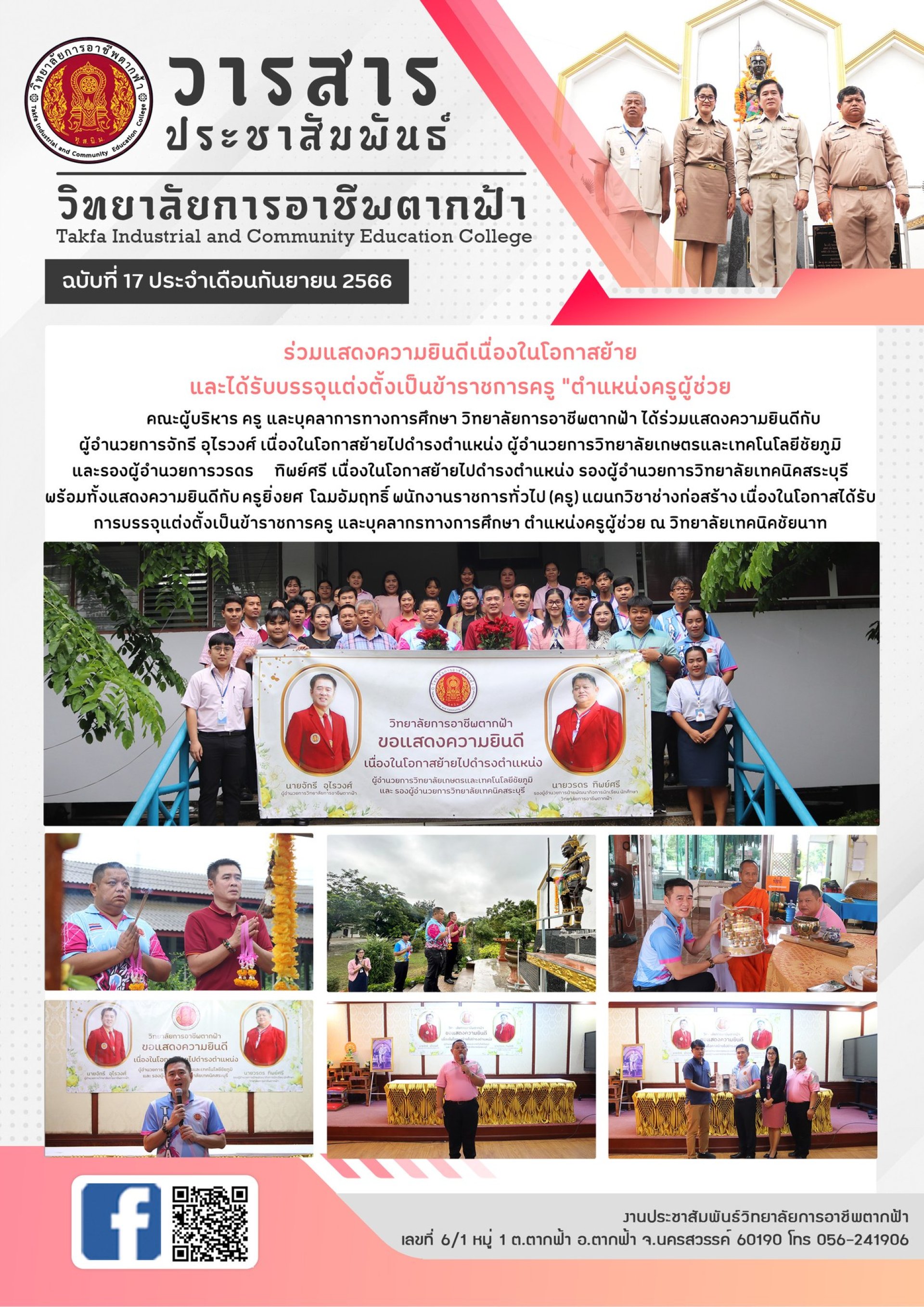 วารสารตากฟ้า ฉบับที่ 17 ร่วมแสดงความยินดีเนื่องในโอกาสย้าย และได้รับบรรจุแต่งตั้งเป็นข้าราชการครู "ตำแหน่งครูผู้ช่วย