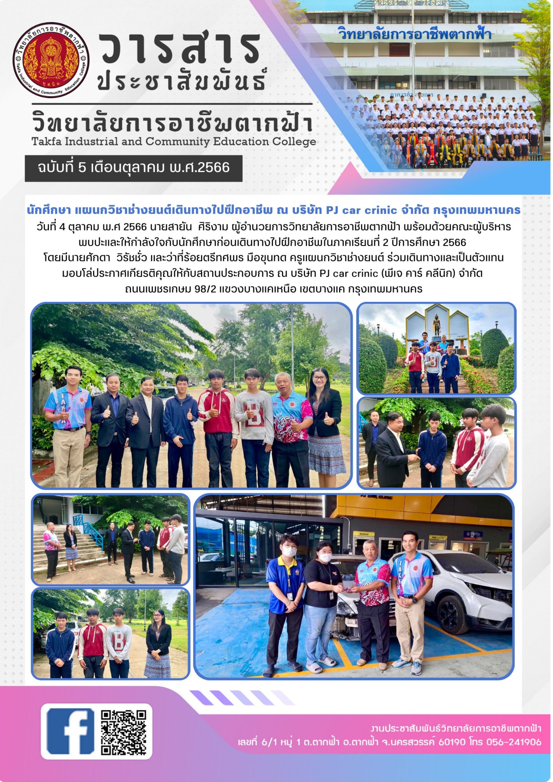 วารสารตากฟ้าประจำเดือนตุลาคม 2566 ฉบับที่ 5 นักศึกษา แผนกวิชาช่างยนต์เดินทางไปฝึกอาชีพ ณ บริษัท PJ car crinic จำกัด กรุงเทพมหานคร วันที่ 4 ตุลาคม พ.ศ 2566