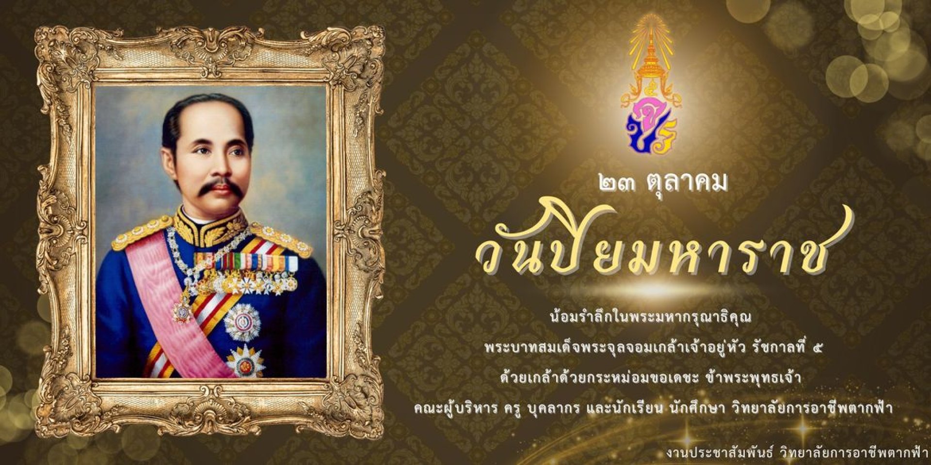 เนื่องในวันคล้ายวันสวรรคตของพระบาทสมเด็จพระจุลจอมเกล้าเจ้าอยู่หัว รัชกาลที่ ๕ "วันปิยมหาราช" วันที่ ๒๓ ตุลาคม ๒๕๖๖ น้อมรำลึกในพระมหากรุณาธิคุณ ด้วยเกล้าด้วยกระหม่อมขอเดชะ ข้าพระพุทธเจ้า คณะผู้บริหาร ครู บุคลากร และนักเรียน นักศึกษา วิทยาลัยการ